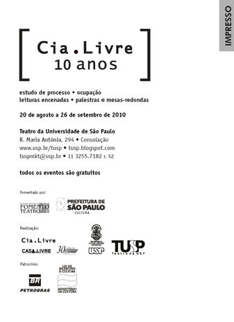 O projeto CIA.LIVRE DEZ ANOS revê os dez anos de existência da Cia.Livre, enfocando os processos de criação de seis espetáculos constituintes da nossa história, a fim de provocar uma reflexão critica sobre nosso percurso criativo presente, prospectando o futuro.