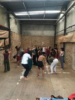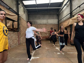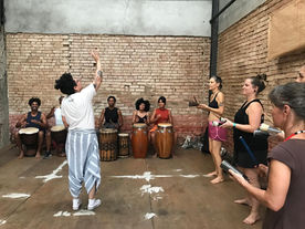 A oficina de dança foi ministrada por Janette Santiago (artista da dança, atriz, orientadora corporal, educadora e estudiosa de experimentos afro corpóreos), visando um mergulho em práticas do corpo, especialmente pelo repertório das religiões de matriz africana, para compor as coralidades dos exercícios cênicos apresentados ao final do projeto A Marcha das Mulheradas.